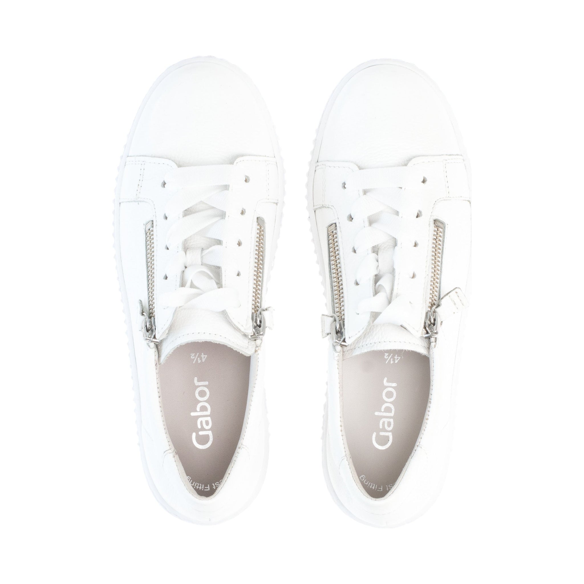 The Gabor Wisdom is a core staple season after season - the perfect trainer for everyday wear. With a choice of white leather or Gold, it features a 3.5 cm flatform sole for cushioned comfort and a stylish contrast. Its 'Best Fit' innersoles keep your feet cool and cozy. Plus, with laces and a zip, it's easy to adjust and wear. Versatile and functional with removable insoles for customizability.